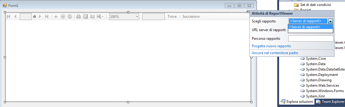Dalla barra degli strumenti trasciniamo il controllo “ReportViewer” , gli impostiamo la larghezza secondo le nostre esigenze.