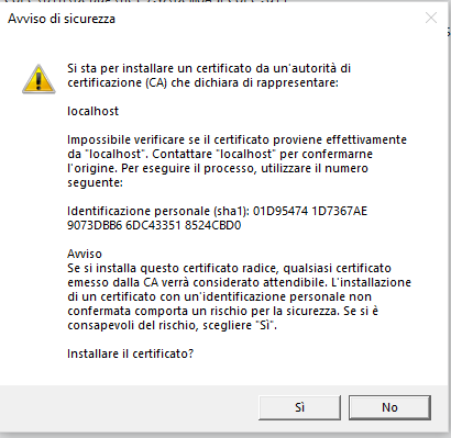 Ci viene richiesto di installare sulla root dell'applicazione un certificato SSL per avviare una connessione localhost in https. Provvediamo a farlo e seguiamo gli steps successivi.
