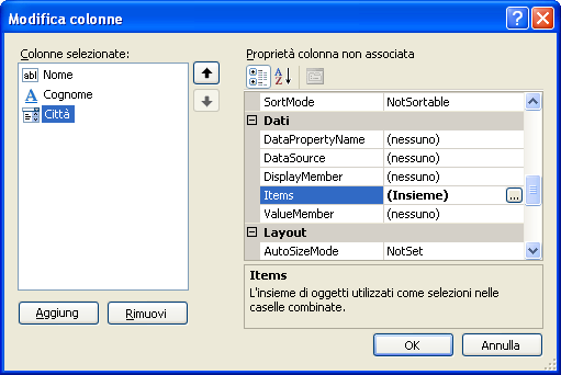 Selezioniamo la colonna quella relativa alla città e selezioniamo la proprietà items (figura 2), la quale ci apre una finestra dove aggiungere degli elementi, scriviamo i seguenti valori, Roma, Reggio Calabria e Berlino, e facciamo click sul pulsante ok. Un altra considerazione da notare è quella di impostare la proprietà DataPropertyName, delle colonne appene create, con il nome del campo della tabella a cui si vuole legare la colonna, per esempio la colonna nome, riportare i dati della tabella anagrafica del campo nome, e così via tutte le altre colonne del controllo datagridview.
