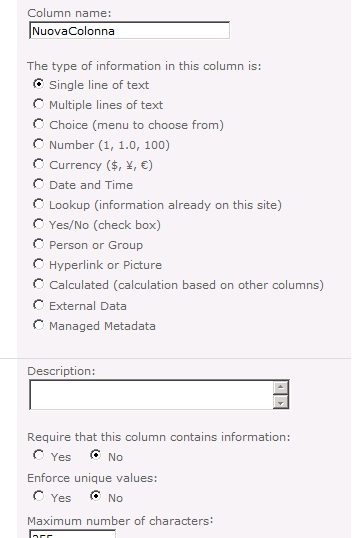 Altri campo permettono la gestione della descrizione, se è un dato obbligatorio, il numero massimo dei caratteri, se è una colonna calcolata, il valore di default, se visualizzarlo nella raccolta documenti.