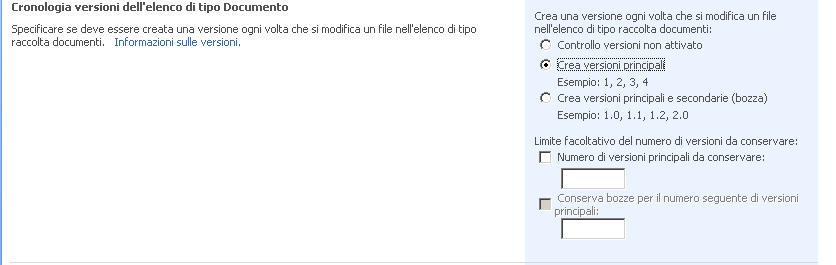 Selezionare la voce di opzione “Crea versioni principali” situata nella parte “Cronologia versioni dell'elenco di tipo documento” A questo punto confermiamo tramite il pulsante ok.