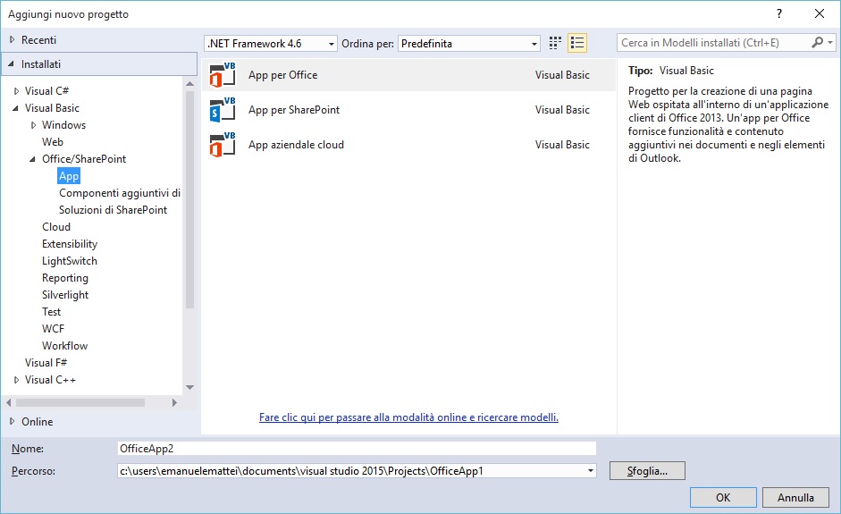 Si crea un nuovo progetto di tipo App in Visual Studio 2015, tramite la finestra di nuovo progetto, selezioniamo il linguaggio di nostro interesse, e la categoria “Office”, a questo punto la sottocategoria Office/sharepoint, selezioniamo come progetti il modello “App per office”, il tutto come mostrato in figura 1.