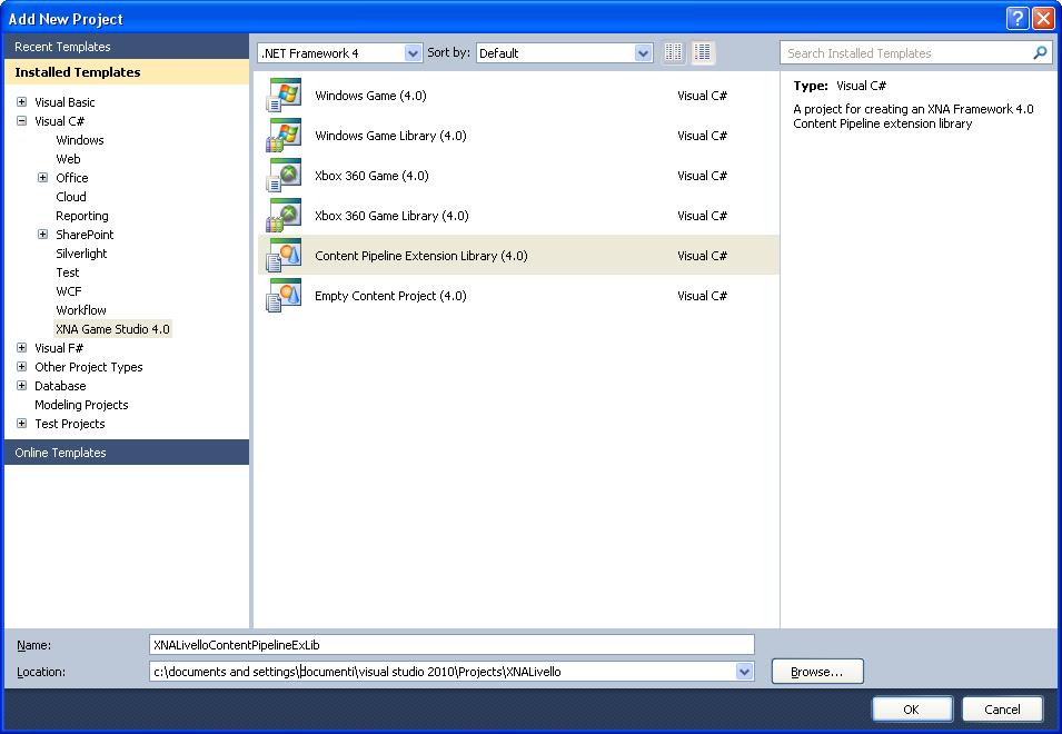 Terminata tale operazione, non ci resta che creare il terzo progetto, è precisamente un “Content pipeline Extension library” , mettendo come nome “XNALivelloContentPipelineExLib” il tutto come illustrato nella figura 4.