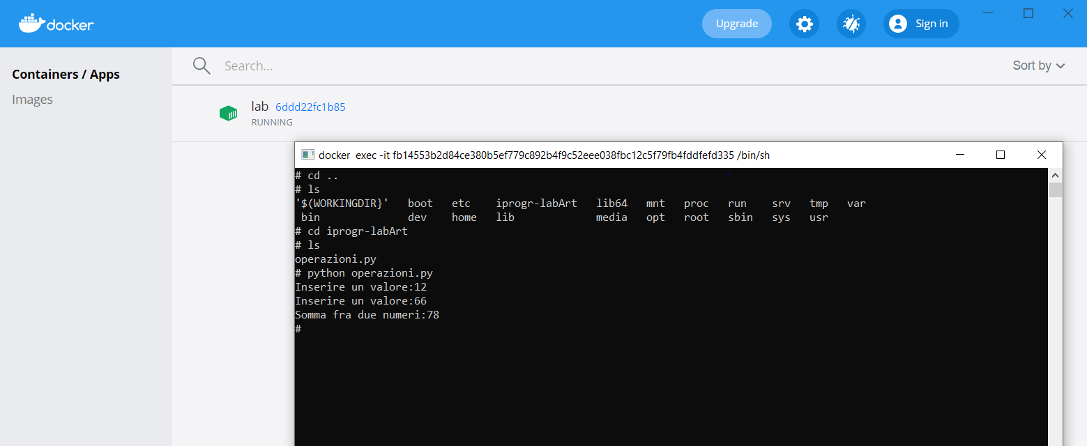 poi ci basterà di ritornare sul container in stato running e cliccando sull'icona esplora potremmo avviare una shell di linux che vediamo in questa illustrazione grafica finale: