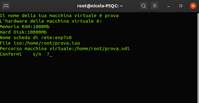 Nel caso volessimo rivedere le impostazioni inserite basta scrivere s ed avremo il riepilogo della nostra macchina virtuale