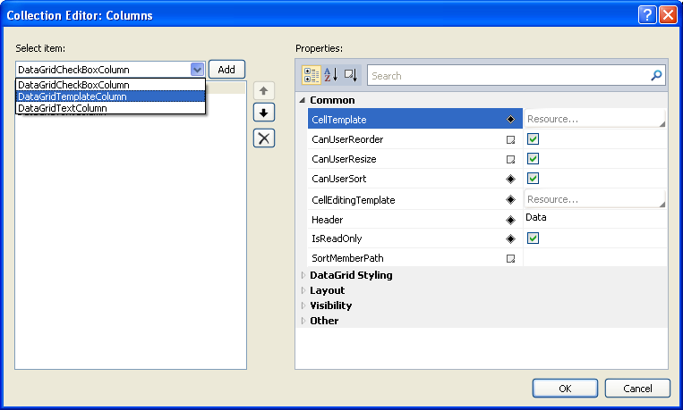 <sdk:DataGridTemplateColumn CanUserReorder="True" CanUserResize="True" CanUserSort="True" Header="Data" Width="Auto" />
