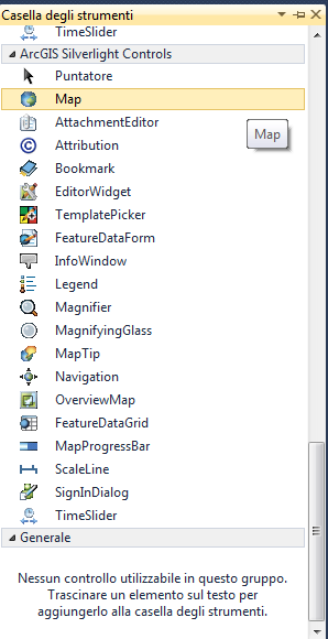 Una volta creato il progetto, a seconda del vostro linguaggio di programmazione (VB.Net o C#), noterete nella barra degli strumenti (figura 8) una nuova categoria, nella quale si trovano i controlli per il GIS.