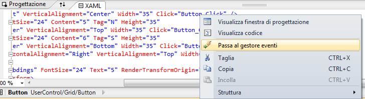 Tramite il click del tasto del mouse sul testo relativo all’evento click, verrà visualizzato un menu (figura 2) se selezioniamo la voce “Passa al gestore eventi” verrà generato l’evento per tutti i pulsanti.