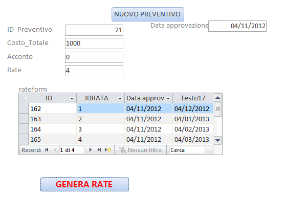 Ho creato la maschera PREVENTIVI e la sottomaschera RATE.