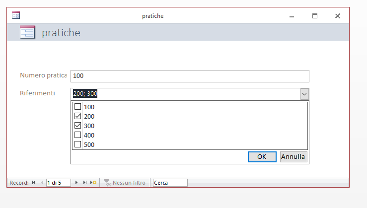 Se è come presumo, cioè che ogni volta vengono fatte ricerche, in base al richiedente, andando a verificare i documenti presenti, spulciando tutte le pratiche, la situazione non si risolve con una semplice tabella uno a molti o molti a molti e non si risolve con una combo box multivalore, ma va sviluppato un sistema articolato che permetta di automatizzare tutto il processo di ricerca, immissione e visualizzazione, perchè se l'operatore deve fare manualmente tutte le ricerche, segnarseli da qualche parte, magari su un foglio di carta, e poi creare manualmente le relazioni tra i vari documenti, conviene veramente usare gli schedari cartacei.