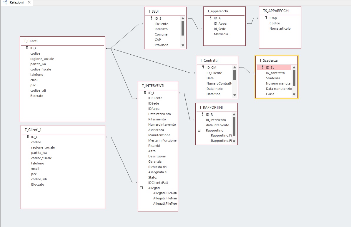 Il cliente è al centro, ogni cliente può avere più sedi ed ogni sede può avere uno o più apparecchi ognuno dotato della sua matricola.