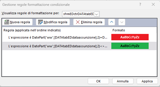 Per le opzioni, visto che la domenica non serve puoi combinare oltre al numero della settimana l'esclusione della formattazione se 1avv è una data di domenica. L'unico intoppo nell'impostazione di default è che nell'intervallo date da lunedì a domenica hai due risultati, uno per la settimana da lunedì a sabato, supponiamo settimana 3, mentre la domenica è vista come settimana 4. Se escludi le domeniche qualsiasi confronto tra numero settimana verifica la condizione. Magari se la data è una domenica sottrai una unità. Giusto per tamponare in attesa di capire perché esegue una correzione automatica alla condizione imposta.