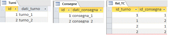 Nel mio database ho una tabella "Consegne" e una tabella "Turni". Più consegne possono essere in più turni, quindi la relazione che li lega è molti a molti. Per farlo ho realizzato una terza tabella "Rel_TC" relazionata in questo modo: