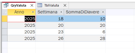 SELECT Year([valuta]) AS Anno, DatePart("ww",[valuta],2,2) AS Settimana, Sum(TblValuta.Diavere) AS SommaDiDiavere