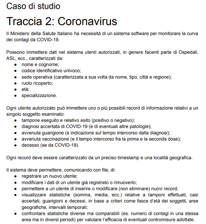 Il sistema deve poter essere utilizzato da personale autorizzato (occorre quindi una struttura dati per l'utente). L'utente può inserire una o più informazioni relative a un singolo paziente (quindi, suppongo, altra struttura dati di cui alcuni campi possono essere anche lasciati vuoti). Ogni record( cioè le strutture dati?) Devono essere possibili le seguenti operazioni: