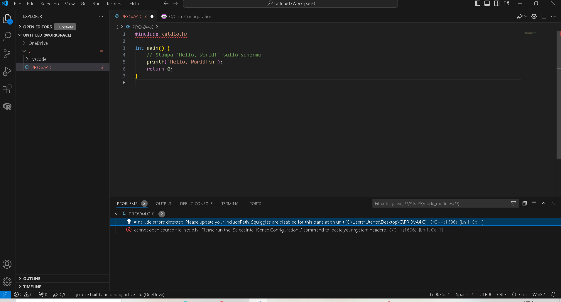 Salve, non riesco a far runnare i miei programmi su vsc in C,allego le immagini degli errori che mi escono fuori. spero possiate aiutarmi.