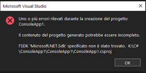 Alla creazione di un nuovo progetto viene presentato l'errore