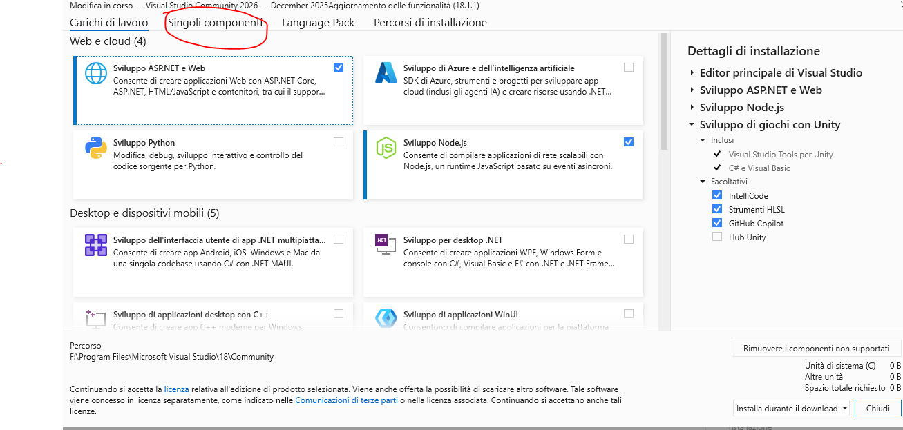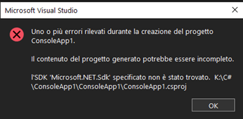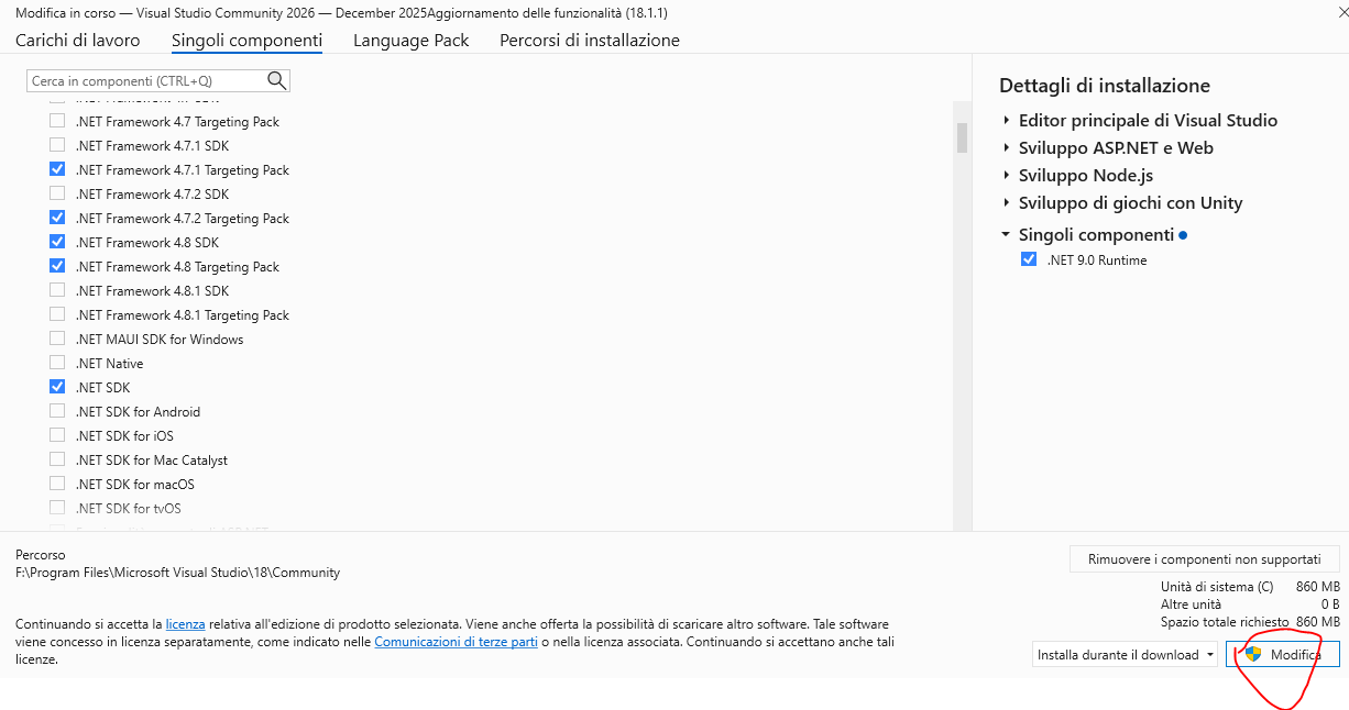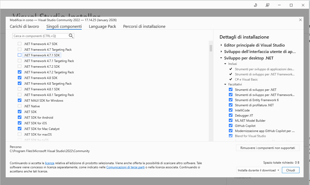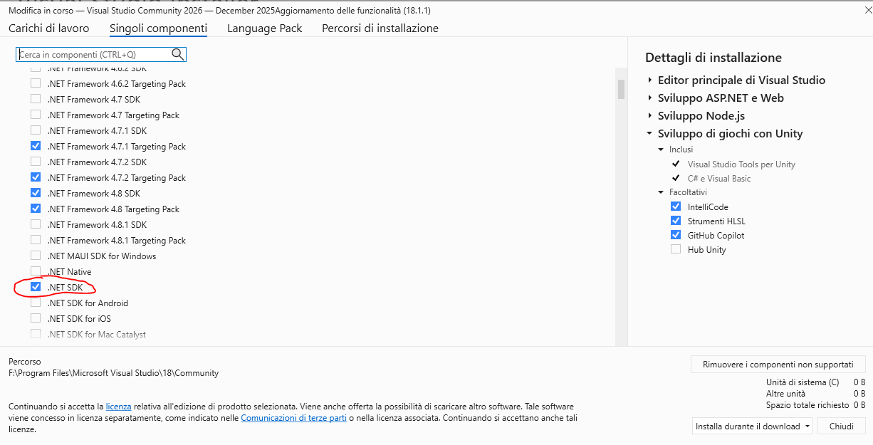 Ciao @Pensionato, per installare i componenti di VS mancanti, tipo .NET SDK, ti consiglio di provare a utilizzare il "Visual Studio Installer".