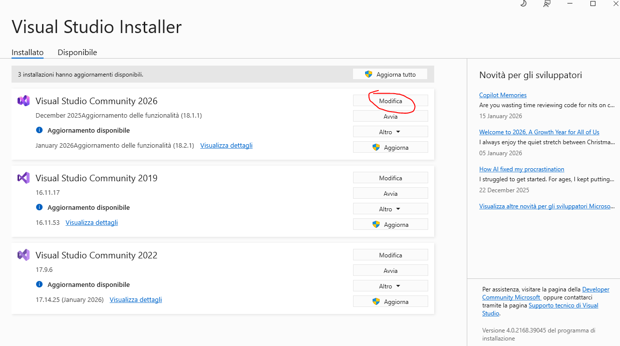 cliccando il pulsante "modifica" verrà installato correttamente il componente mancante sulla versione di Visual Studio selezionata nella prima schermata.