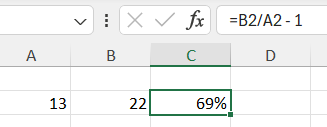 Ritenevo che dedurre dall'articolo la formula =(B2-A2)/A2 [o come preferirei scriverla io =B2/A2-1], fosse alla tua portata. Il fatto che affermi