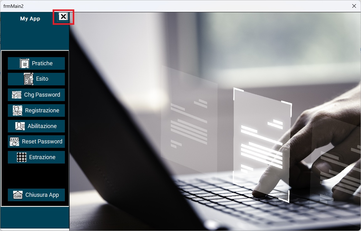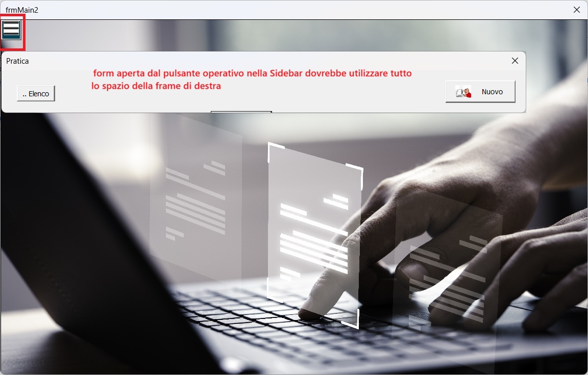 - eliminare lìimmagine di sfondo e aprire la form richiesta dentro lo spazione dellaa frame massimizzata e operare dentro lo spazio massimizzato.