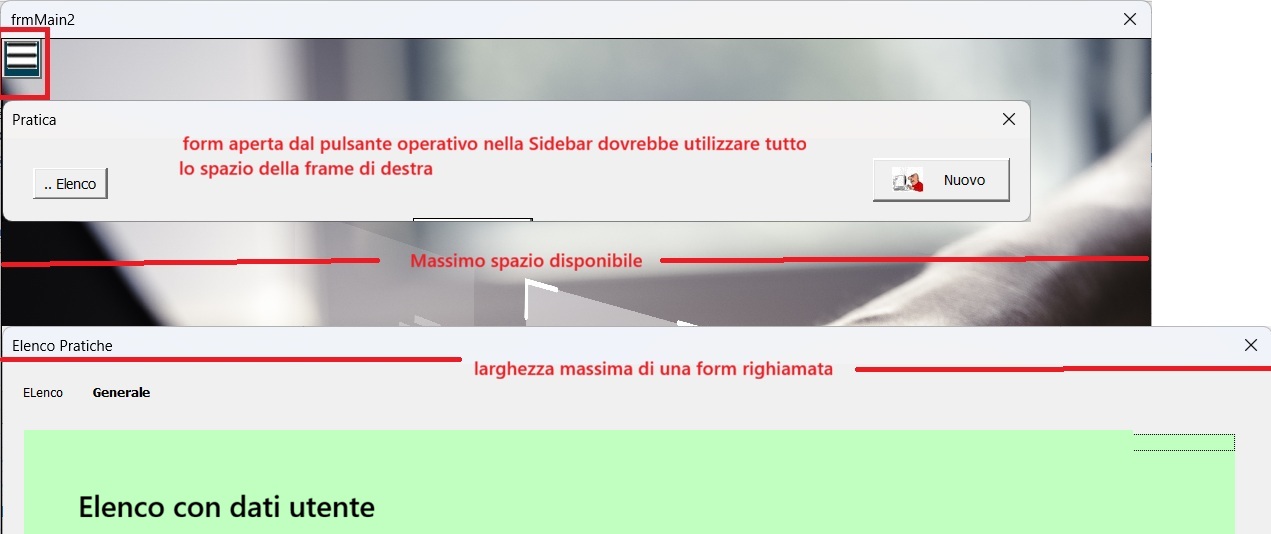 In alternativa pensavo di risolvere, se la soluzione di gestire le videate all'interno della larghezza della Frame massimizzata diventa impraticabile, selezionando la funzione dai bottoni della Sidebar, mettere in hide la frmMain (che contiene la Sidebar) o facendo unload della stessa e facendo lo