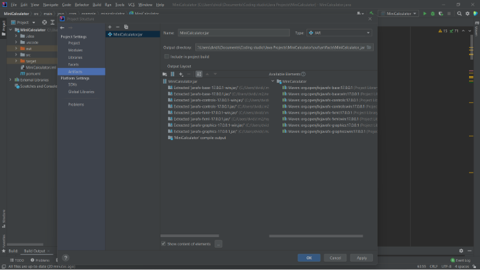 Ho iniziato a esercitarmi con JavaFX creando una semplice calcolatrice, come IDE utilizzo IntelliJ idea e eseguendo il programmino tramite run tutto funziona correttamente, il problema si crea quando eseguo la build, infatti l'eseguibile che ottengo nella cartella out non da nessun cenno di vita quando premuto. Non ho trovato nessuna soluzione in giro su internet e nonostante io esegua tutti i passaggi nulla sembra funzionare; lascio allegato il codice e gli screenshot.