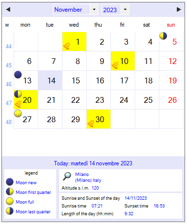 Pertanto implementerò una tabella con tali valori e per ogni giorno del calendario (presente, passato e futuro) avendo impostato il comune che interessa come default, si ottiene l'orari dell'alba, del tramonto e le ore di luce, etc… utili per dare informazioni aggiuntive al calendario.